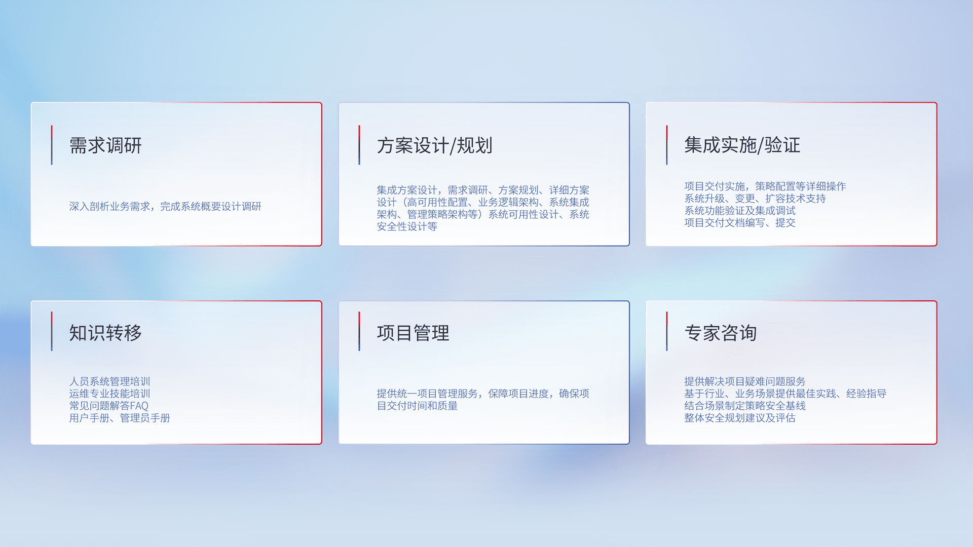 针对客户行业特性,,将宏观的安全战略和需求,,,通过专业的交付服务,,实现项目落地,,为客户提供标准规范的集成交付服务。。。。